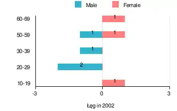According to the 2002 Poland census, there were 7 people residing in Łęg village, of whom 57.1% were male and 42.9% were female. In the village, the population was spread out, with 14.3% under the age of 18, 42.8% from 18 to 44, 28.6% from 45 to 64, and 14.3% who were 65 years of age or older.[2]