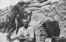 The regiment returned to garrison duty, and supplied a number of officers and men to the various departments and staffs that were being set up:[22] among those who left was Capt Arnold Ward, Member of Parliament for Watford, who was appointed to command a convalescent camp in Cyprus. On 9 August 1915 1/1st Herts Yeomanry received a warning order to prepare to sail to Gallipoli as reinforcements for the bogged-down Dardanelles Campaign. Together with the Westminster Dragoons in the former Yeomanry Mounted Brigade (redesignated as the 5th Mounted Brigade) they were to be attached to the 2nd Mounted Division – all operating dismounted in the infantry role. Each regiment left the equivalent of a squadron HQ and two Troops to look after the horses, and on 14 August the 1/1st Herts Yeomanry embarked on HMS Knight Templar at Alexandria. It arrived on 17 August at Lemnos, where it left behind a further party at the base at Mudros with the regimental transport It then trans-shipped to the SS Queen Victoria, which ferried the regiment to Suvla Bay, where a fresh landing had been made on 6 August. The regiment landed after dark and spent the next two days building dugouts and roads. On 21 August the 2nd Mtd Division was in reserve for the Battle of Scimitar Hill. The Yeomanry moved out of their bivouacs at Lala Baba at 15.30 towards Chocolate Hill, expecting then to pass through the attacking 29th Division on Scimitar Hill to secure the final objective. However, after two gallant attempts to take Scimitar Hill, 29th Division's attack had died out by 17.00 and the Yeomanry came under heavy converging fire as they crossed the salt lake and approached Chocolate Hill. The Herts Yeomanry lost their CO, Lt-Col Gurney Sheppard, who was killed, and about 40 ORs, of whom 11 died. 5th Mounted Bde stayed in reserve on Chocolate Hill while the rest of 2nd Mtd Division made another disastrous attack on Scimitar Hill. After this had failed, the division was withdrawn after dark to Lala Baba. Major Halsey took over temporary command of 1/1st Herts Yeomanry until Maj Ted Sheppard could be summoned from Egypt. After a day's rest the regiment went up the following night to take over defence of the trenches forward of Chocolate Hill, where it remained until 28 August.[3][9][15][21][23][24]