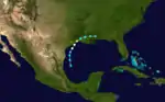Little more than a day after the dissipation of the previous hurricane, a broad area of low pressure over the western Caribbean Sea developed into a tropical storm while centered about 180 miles (290 km) east-southeast of Punta Allen, Quintana Roo, Mexico.[4][12] Over the next two days, the storm meandered toward and through the Yucatán Channel, gradually intensifying as it proceeded to the north-northwest and north. Late on June 18, the system attained hurricane status off the western tip of Pinar del Río Province, Cuba. The following day, the cyclone turned to the north-northeast, producing "severe gales" (47–54 mph, 76–87 km/h) over the waters off Cuba and Jamaica, as reported by ships.[14] At 00:00 UTC on June 20, the storm reached its peak intensity of 100 mph (160 km/h), and shortly afterward its forward speed accelerated. At 11:00 UTC on June 21, the cyclone made landfall a short distance east of St. Marks, Florida, as a Category 2 hurricane.[4] The storm gradually decreased in intensity over the next day and a half as it crossed the Southeastern and Mid-Atlantic states. By 18:00 UTC on June 23, the system passed about 70 miles (110 km) southeast of New York City and curved to the east before dissipating a day later.[4]