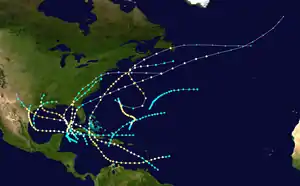 The 1886 Atlantic hurricane season ran through the early summer and the first half of fall in 1886. This is the period of each year when most tropical cyclones form in the Atlantic basin. It was a very active year, with ten hurricanes, six of which struck the United States,[1] an event that would not occur again until 1985 and 2020. Four hurricanes became major hurricanes (Category 3+). However, in the absence of modern satellites and other remote-sensing technologies, only storms that affected populated land areas or encountered ships at sea are known, so the actual total could be higher. An undercount bias of zero to six tropical cyclones per year between 1851 and 1885 and zero to four per year between 1886 and 1910 has been estimated.[2] Of the known 1886 cyclones, Hurricane Seven and Tropical Storm Eleven were first documented in 1996 by Jose Fernandez-Partagas and Henry Diaz. They also proposed large alterations to the known tracks of several other 1886 storms.[3]