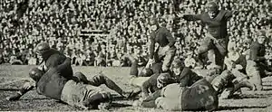 - ↑ The game account published by the Chicago Daily Tribune credited Molenda with the third touchdown.[34] The AP account, and accounts in other papers, credited Molenda with the same touchdown.[32]