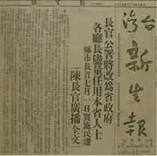 Taiwan's electoral history could trace back to Japanese rule in 1935, but the suffrage by then was limited.[3] In 1947, anti-government uprisings erupted, with protestors calling for political reform. Despite promising the implementation of reforms including local elections, Chen Yi, Chief Executive of Taiwan Province, secretly asked for reinforcement from mainland China to suppress the uprisings.