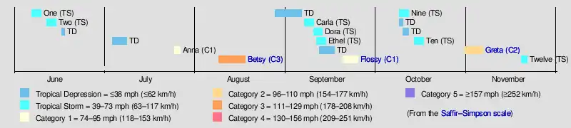 The season officially started on June 15, although an unnamed storm developed about a week prior over the western North Atlantic Ocean. A later storm that formed over the Gulf of Mexico on June 12 alleviated drought conditions in the south-central United States. Hurricane Anna developed in late July and hit Mexico. Tropical storms Carla and Ethel both formed near the Bahamas and moved northeastward until dissipating. The only hurricane that hit the contiguous United States was Hurricane Flossy. One of the final storms of the year, Greta, was an unusually large hurricane that produced high waves from Florida to the Lesser Antilles. It developed in the western Caribbean and moved across much of the southeastern United States, causing $24.8 million in damage and 15 deaths. There were also several tropical depressions, as well as one subtropical cyclone, in the season.