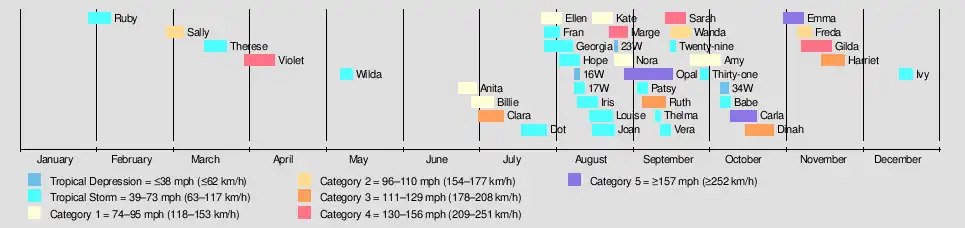 The 1967 Pacific typhoon season was one of the most active Pacific typhoon seasons on record, witnessing the formation of 35 tropical storms during the season. It began on January 1, 1967, though most storms usually form between June and December within the basin. The first storm of the season, Ruby, formed on January 28 west of the Philippines. The scope of this article is limited to the Pacific Ocean, north of the equator and west of the international date line. Storms that form east of the date line and north of the equator are called hurricanes; see 1967 Pacific hurricane season. Tropical depressions that are monitored by the United States' Joint Typhoon Warning Center (JTWC) were given a numerical designation with a "W" suffix, and any storms reaching 1-minute sustained winds of over 40 mph were given a name. Tropical depressions that enter or form in the Philippine area of responsibility are assigned a name by the Philippine Atmospheric, Geophysical and Astronomical Services Administration or PAGASA. This can often result in the same storm having two names.