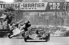 James Hunt was allegedly pushed from behind, though no one knows for sure, and when he hit John Watson's right rear wheel with his left front, he was launched six feet in the air, showing Watson the entire underside of his McLaren. On landing, he slid past Reutemann and down the escape road. Hunt was able to make it back to the pits, and though his suspension was bent, he carried on, and ended up missing a point for sixth by just two seconds.
