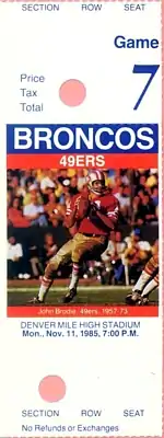 A ticket for a November 1985 game between the 49ers and the Denver Broncos.