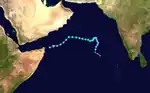Toward the end of April, an area of convection persisted in the southern Bay of Bengal.[4] It developed into a distinct low-pressure area on May 1 over the body of water, but soon moved westward into India without developing. On May 4, the system emerged from Kerala into the Arabian Sea,[1] and soon after convection rapidly increased. Early on May 5, the JTWC classified the system as Tropical Cyclone 01A about 370 km (230 mi) west-southwest of Kochi, India.[4] On the same day, the IMD began classifying it as a depression, but soon after upgraded it to a deep depression and later cyclonic storm after increased organization.[1] The storm meandered off southwest India for three days due to weak steering currents. During that time, the convection pulsed around the circulation,[4] and the IMD upgraded it to a severe cyclonic storm on May 7 with winds of 100 km/h (60 mph).[1] By contrast, the JTWC only estimated peak winds of 85 km/h (55 mph).[2] Increased wind shear, cooler waters, and dry air rapidly weakened the convection, exposing the center and causing the storm to deteriorate quickly into a depression. On May 10, the system degenerated into a remnant low off Gujarat, without any discernible low-level circulation.[1][4]