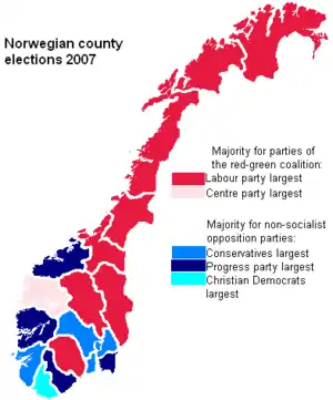For the country at large, the election produced a major setback for the Socialist Left Party, while most other parties, including the two other parties of the governing Red-Green Coalition, the Norwegian Labour Party and the Centre Party, made some advances or held their position from 2003.