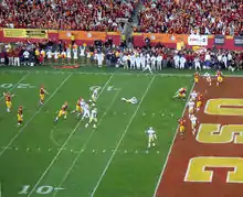 The team entered the season with high expectations. It was ranked No. 1 in all national pre-season polls, picked unanimously to win the Pac-10 Conference and expected to contend for a national championship.[2][3][4][5][6] Those hopes were dealt a major blow when the Trojans lost to 41-point underdog Stanford in a mid-season game that was named one of the greatest upsets in a season that became defined by them.[7][8][9] After their second loss, there were questions as to whether the team would be able to even win their own conference, let alone compete nationally.[10][11] However, USC defied mid-season expectations and rallied, finishing the season ranked No. 2 in the Coaches' Poll and No. 3 in the Associated Press (AP) Poll.[12][13] By the end of the season various sports journalists said the Trojans were playing the best football of anyone in the country.[14][15][16][17][18]