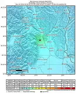 The 2014 Vrancea earthquake struck Vrancea County on 22 November 2014 at 21:14:17 local time, with a moment magnitude of 5.7.[1] The earthquake occurred at a depth of 39 kilometers and lasted for thirty seconds. On the Mercalli scale the quake registered an intensity of VI (Strong).[2][3][4]