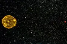 51 Pegasi was listed as a standard star for the spectral type G2IV in the 1989 The Perkins catalog of revised MK types for the cooler stars. Historically, it was generally given a stellar classification of G5V,[14] and even in more modern catalogues it is usually listed as a main-sequence star.[15] It is generally considered to still be generating energy through the thermonuclear fusion of hydrogen at its core, but to be in a more evolved state than the Sun.[6] The effective temperature of the chromosphere is about 5,571 K (5,298 °C; 9,568 °F), giving 51 Pegasi the characteristic yellow hue of a G-type star.[16] It is estimated to be about 6.1 billion years old, somewhat older than the Sun, with a radius 24% larger and 11% more massive. The star has a higher proportion of elements other than hydrogen/helium compared to the Sun; a quantity astronomers term a star's metallicity. Stars with higher metallicity such as this are more likely to host giant planets.[17] In 1996, astronomers Baliunas, Sokoloff, and Soon measured a rotational period of 37 days for 51 Pegasi.[18]