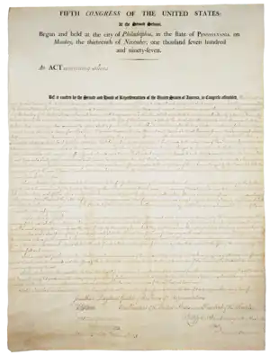 The 5th United States Congress was a meeting of the legislative branch of the United States federal government, consisting of the United States Senate and the United States House of Representatives. It met at Congress Hall in Philadelphia, Pennsylvania, from March 4, 1797, to March 4, 1799, during the first two years of John Adams' presidency. In the context of the Quasi-War with France, the Alien and Sedition Acts were passed by Congress. The Acts were overwhelmingly supported by the Federalists and mostly opposed by the Democratic-Republicans. Some Democratic-Republicans, such as Timothy Bloodworth, said they would support formally going to war against France but they opposed the Alien and Sedition Acts which Bloodworth and others believed were unconstitutional.[1]