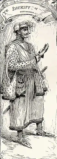 The fellowship catches up with the Sheriff. Robin stops the Sheriff, asking about the news from the King. Robin then quickly draws his bow, and lets loose an arrow that knocks the Sheriff off his horse. Before the Sheriff can rise, Robin beheads him with his sword. Lie there, proud Sheriff, taunts Robin, no man could trust you while you were alive.[2]: lines 1265-1412