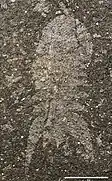Aaveqaspis is a genus of small (about 2.5 centimetres or 1.0 inch long) marine arthropods of unclear affiliation, that lived during the early Cambrian period.[1] Fossil remains of Aaveqaspis were collected from the Lower Cambrian Sirius Passet fossil-Lagerstätte of North Greenland. Aaveqaspis looks like a soft eyeless trilobite with a weakly defined axis, a headshield (or cephalon) with stubby genal spines, 5 thorax segments also ending in stubby genal spines, and a tailshield (pygidium) with a pair of massive tusk-like spines, and two smaller spines near the end of the axis. The only species presently known is A. inesoni (i.e. the genus is monotypic).