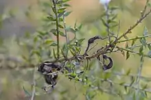 The bushy and prickly shrub typically grows to a height of 0.4 to 1.5 metres (1 to 5 ft)[3] with an erect or decumbent habit. The branchlets are terete with fine ridges and light to densely hairy. The sessile phyllodes have an ovate to lanceolate or elliptic shape and are 0.8 to 1.5 centimetres (0.31 to 0.59 in) in length and 2 to 4 millimetres (0.079 to 0.157 in) wide.[1] It blooms from July to October and produces yellow flowers.[3] The simple axillary inflorescences have globose heads containing 12 to 18 bright yellow flowers and have a diameter of 4 to 6.5 mm (0.157 to 0.256 in). Following flowering curved to twisted seed pods form with a length of 3 to 7 cm (1.2 to 2.8 in) and are 3 to 5 mm (0.118 to 0.197 in) wide.[1]