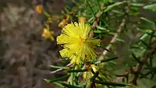 The intricate multi-branched shrub typically grows to a height of 2 m (6 ft 7 in) and has hairy branchlets with 1 to 2 mm (0.039 to 0.079 in) long stipules. When it blooms it produces yellow coloured flowers.[1]