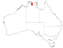 It is endemic to the Northern Territory where it is confined to an area within Kakadu National Park where it is often situated on rocky ledges, usually amongst boulders growing in sandy soils over sandstone as a part of open Eucalyptus woodland communities with an understorey of Triodia.[1]