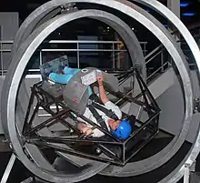 An aerotrim (also known as Multi-Axis Trainer or MAT) is a 3-axis gimbal large enough to contain a human being, used for cardiovascular workout and equilibrioception (balance) training in pilots and astronauts. Aerotrims saw use in gyms during the 1980s, but are currently out of production outside of niche professional applications. A handful of machines are still in circulation, largely used for entertainment at fairs and events and as science fiction showpieces in movies and television. Several companies around the world have picked up the idea and produced their own version with slight changes. One of the originals, made in Korea, can be found in Slovenia at Aerotrim Ekopool Celje.[1]