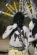 The Gaan dancers chant and keep beat with the same dance step as the girl, while in motion they lead the participant guests about the plaza. Eventually the girl follows the "clown" Gaan around the plaza and the guests fall in line after her. Upon returning to her original position, the Gaan surround the girl. The "clown" holds a mixture of ochre and corn pollen that is sprinkled or brushed over the girl by the other Gaan. Any remaining pollen may be emptied from the basket over her head and body. The Gaan bring a powerful spirituality to the ceremony as the Apache girl is transformed and attains womanhood.[1]