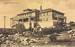In the early 20th century, the idea for a retirement home in the Arizona Territory originated with three prominent Arizonans: Major A. J. Doran, a judge and territorial representative; rancher Johnny Duke; and businessman Frank M. Murphy, the brother of former Arizona territorial governor Oakes Murphy. They thought that Arizona should provide a rest home for aging settlers who moved to Arizona to help establish the area.[2] Doran sponsored a bill to fund the idea, presented to the 24th Arizona Territorial Legislature in 1907, but it was not passed. Journalist Sharlot Hall handled clerical duties regarding the bill.[3] Submitted again in 1909, both houses of the legislature passed the bill, and Territorial Governor Joseph Henry Kibbey signed the bill into law on March 11, 1909. Sited on a prominent granite hill overlooking Prescott's town square, Murphy put up 4.5 acres (1.8 ha) of his land for the building. Judge T.G. Norris later donated adjacent land for expansion.[4] To design the building, a female architect was selected: W.S. Elliott of Prescott, who had come to prominence for her work on St. Joseph's Academy.[5] The three-story retirement home, built of brick with wooden porticos, was completed at a cost of $25,000. Doors opened on February 1, 1911, with Doran as supervisor. Doran presided for the first year, during which time Arizona became a state.[2]