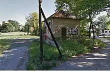 Traffic has been stopped since the fall of 2017, following the impact of construction of a 15-storey facility on the river bank by Nordic Astrum.[8] During the first building works, the street ground was displaced, resulting in a small landslide that fissured the house at 8 Babia Wieś Street, damaging the road surface, unsealing a gas pipeline and weakening the foundations of the tram track. The repair of the 130 metres (430 ft) of missing tracks, necessary for a re-opening, is not foreseen before the end of 2023.[9]