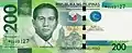 In 2001, the BSP upgraded the security features (visible fibers, value panel, security thread and watermark) of 1000, 500, and 100-peso banknotes with additional security features like a second glossy security thread, iridescent strip, fluorescent printing, optically variable ink, and microprints.[10] In 2002, the Bangko Sentral issued a new 200-peso banknote with the same aforementioned security features and with the face of former President Diosdado Macapagal. His daughter, Gloria Macapagal Arroyo, is at the back of the 200-peso banknote which showed her being sworn into office at the EDSA Shrine. She is the first president whose image has been included in a banknote while in office since emergency currency was issued by various provincial currency boards during World War II.