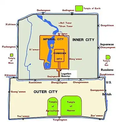 Peking had formidable defense works. The city was surrounded by walls 21 miles in length and broken by 16 gates. The wall around the Inner (Tartar) city was 40 feet tall and 40 feet wide at the top. The wall around the adjoining Outer (Chinese) city was 30 feet high. The population living within the walls was about one million people, although many had fled to escape the Boxers and the fighting between the Chinese army and the foreigners in the Legation Quarter.[6]