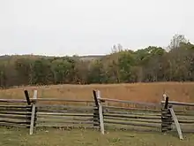Anderson then turned to cross Little Sailor's Creek when Gordon's corps came up to Holt's Corner.[69] Johnson's and Pickett's divisions set up breastworks across the road as Ewell's corps also crossed to set up a defensive line.[69] Anderson's position was almost 1 mile (1.6 km) south of Ewell's position on a ridge across Sailor's Creek.[76]