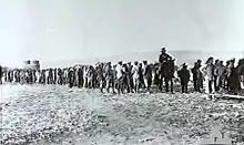 The attack began before dawn, when the two leading light horse squadrons were heavily fired on by rifles and machine guns from several outposts at 04:25, causing nearly 100 horse casualties.[9][17][26] No reconnaissance by the light horse had been possible, but the 19th Lancers reported that the village and station buildings lay at the end of a flat plain 2.5 miles (4.0 km) wide, without any cover and no apparent obstacles to a cavalry charge.[17] This unexpected fire revealed the garrison was deployed covering the open plain for some 700 yards (640 m) south of Samakh, extending on either side to the mountains. The 11th Light Horse Regiment, commanded by Lieutenant Colonel J. W. Parsons, had planned to attack the garrison's flank, but as no flank attack was possible, he swung the regiment around to attack straight on. A and B squadrons galloped on either side of the railway line, with all 12 machine guns of the 4th Machine Gun Squadron providing covering fire for the charging squadrons. They fired at the flashes created by the Ottoman rifles and machine guns.[17][27]
