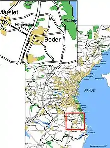 Beder is a town with a population of 4,372 (9 January 2012)[1] in Jutland in Denmark. Some consider Beder & the neighbouring town of Malling as one urban area. DST has since 2012 considered the towns one urban area making it the 84th largest in Denmark with a total population of 8,898 in 2020.[2]