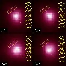 In 1995, the Hubble Space Telescope's Faint Object Camera captured an ultraviolet image with a resolution superior to that obtained by ground-based interferometers—the first conventional-telescope image (or "direct-image" in NASA terminology) of the disk of another star.[52] Because ultraviolet light is absorbed by the Earth's atmosphere, observations at these wavelengths are best performed by space telescopes.[53] Like earlier pictures, this image contained a bright patch indicating a region in the southwestern quadrant 2,000 K hotter than the stellar surface.[54] Subsequent ultraviolet spectra taken with the Goddard High Resolution Spectrograph suggested that the hot spot was one of Betelgeuse's poles of rotation. This would give the rotational axis an inclination of about 20° to the direction of Earth, and a position angle from celestial North of about 55°.[55]