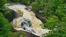 Great Conglomerate Falls is the southernmost (the Black River flows north) of the more publicized falls and the first large waterfall on the river's approach to Lake Superior. The river drops 30 feet (9.1 m) around a large piece of conglomerate rock, boulders and tree trunks into a deep gorge. Potawatomi Falls drops nearly 40 feet (12 m) in two sections around a piece of conglomerate rock, similar to Great Conglomerate Falls.