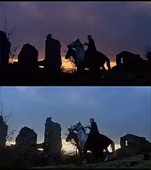 "The Wurdulak" was the last of the short films to be shot, with shooting commencing on either February 25 or 27.[30] While filming, Karloff contracted pneumonia, which led to him having to rely on oxygen tanks after production ended.[31] Bava was initially going to end the film on a shot of Jacqueline Pierreux's dead character.[21] On the last day of filming, Billitteri suggested to not end the film on such a bleak image and told Bava to change it.[21] Bava changed the ending to Boris Karloff's character of Gorka on horseback who cautions the audience to watch out for vampires. The camera then pans back revealing he is on a stuffed horse revealing the studio set and simulated effects.[21]