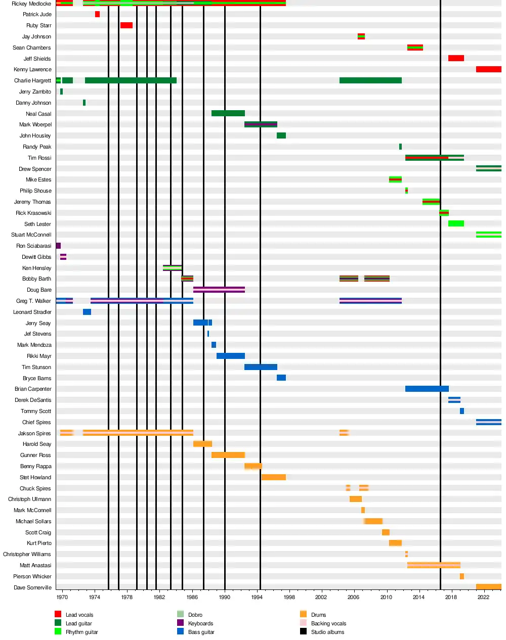 • Rickey Medlocke – lead vocals, rhythm guitar (1969–1971, 1972–1997), drums (1969), lead guitar (1982–1984), dobro (1972–1984)