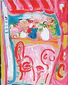 Kane is known for his synthesis of a colorful impressionist palette with a decidedly American sensibility. His works are full of lively brushwork and spontaneity, described by critic Richard J. Boyle as a “fast and furious style of painting.”[1]: 26 MoMA Curator John Elderfield notes that Kane’s paintings “look back through Philip Guston’s coloration and seek to pursue the brightness and freedom associated with Henri Matisse’s palette.”[1]: 17