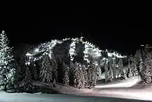 At mid-mountain, a second day lodge (Pioneer Lodge - 1973) sits at 6,800 feet (2,070 m) with a sizable parking lot, a cluster of condominia (1975),[4] and the Jason Harper Training Center. From this Pioneer area, there is direct access to the gentle south-facing slopes served by a high-speed quad chairlift, Morning Star (#2) and the north-facing slopes of the Bitterroot (#5), a double chair lift (vertical: 525 ft (160 m)), which runs only on weekends and holidays. In addition, there is connecting trail access to the base of the Superior Express (#3) lift. With its 1,500-foot (457 m) vertical rise, the Superior Express serves the advanced and expert terrain on the northern face of Shafer Butte, unloading at 7,480 feet (2,280 m). It replaced a Riblet double chairlift built in 1965,[12][13] and cut the ride time of the original lift in half.[14] Night skiing was added to the Superior area with the installation of lights in the summer of 1986, and Morning Star was converted from a double to a triple chairlift in 1999.