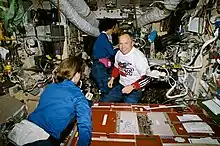Dunbar returned to the Astronaut Office in Houston in December 1993. She was approached by David Leestma, a fellow member of the 1980 group of astronauts who was now the Director of Flight Crew Operations, who informed her that he needed someone to go to Russia as a backup for Norman Thagard, who had been designated to become the first US astronaut to fly in space on the Russian Mir space station.[25] Finding a volunteer for a grueling year-long training program without any assurance of a flight at the end of it had been difficult. No American astronaut had served as a backup since the early days of the Space Shuttle program, and none had flown or even trained for a long-duration mission since Skylab, almost twenty years before.[27]