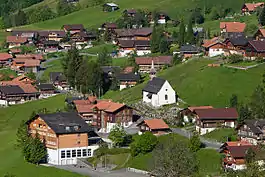 Traditionally, the village economy relied on farming on the valley floors and seasonal alpine herding in the mountain meadows. The scattered farms combined into four Bäuerten (“farmers’ collectives”) to manage alpine meadows. The first modern road to the village was built in 1828 from the Unterseen valley. As mechanization allowed farms to operate with fewer workers, many residents were forced to move to the cities of the Swiss Plateau or emigrate to Germany or the United States. By the 20th century, there was some tourism in the municipality, and two hotels, several vacation homes and a ski lift were built. About one-third of the workforce commutes to jobs in Interlaken or the surrounding municipalities.[3]
