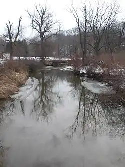 Briar Creek was historically known as the "Kawanishoning" to the area's Native Americans.[9] This name was a Lenni Lenape word for "sweet briar". However, the creek was also referred to as "Kawanishoning Creek" by white soldiers and explorers during the time of the American Revolutionary War. By 1770, some maps began referring to the creek as Bryar Creek, which became the more common name by the end of the eighteenth century and remained so as late as 1840. However, the spelling gradually changed to Brier Creek and then Briar Creek.[8]