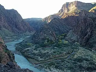 The confluence of the creek with the Colorado River flows through eroded canyons and debris of one of the base units of Granite Gorge on the river, the Vishnu Shist.