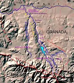 The Cacín River forms in what is now the Los Bermejales Reservoir, where several streams from the Sierras of Tejeda, Almijara and Alhama Natural Park converge. It flows north through a narrow canyon known as the Tajos de los Bermejales, where it has drops of 100 metres (330 ft). The Cacín river irrigates the lands of the west of the Vega de Granada comarca.[5] It joins the Genil to the southwest of Villanueva Mesía.