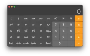 Calculator is a basic calculator application made by Apple Inc. and bundled with its macOS, iOS, and watchOS operating systems. It has three modes: basic, scientific, and programmer.[1] The basic mode includes a number pad, buttons for adding, subtracting, multiplying, and dividing, as well as memory keys. Scientific mode supports exponents and trigonometric functions. The macOS version of Calculator also has a programmer mode that gives the user access to more options related to computer programming.[2]