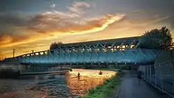 On 23rd December 2021, the Abbey-Chesterton Bridge over the River Cam opened, providing cycle and pedestrian access to the station from the Abbey district of Cambridge and from Fen Ditton. The bridge is part of the Chisholm Trail, a footpath and cycle route linking Cambridge Science Park with Addenbrookes Hospital and Cambridge Biomedical Campus in the south of the city. [44] The bridge provides pedestrian access the Abbey Stadium, Cambridge United Football Club's home ground.