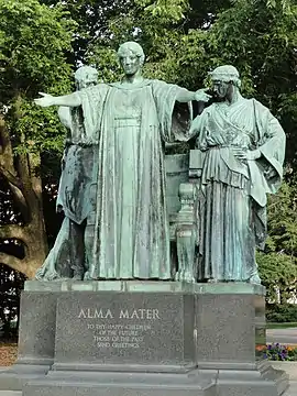 Planted between Altgeld Hall and the Illini Union is the bronze Alma Mater statue by sculptor Lorado Taft. The 10,000-pound statue depicts a mother-figure wearing academic robes and flanked by two attendant male and female figures representing "Learning" and "Labor" after the university's motto. The 1929 statue is iconic for the university and a popular backdrop for student graduation photos.