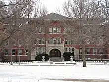The Gregory Drive Residence Halls consisted of Forbes Hall, Garner Hall, and Hopkins Hall.[30] The Peabody Drive Residence Halls consisted of Scott Hall, Snyder Hall, and Weston Hall.[31] These six halls were commonly nicknamed the "Six Pack" due to their identical, connected structures and due to the persona of the area being where partiers lived on campus.[30][31] Finally, the 4th Street Residence Halls consisted of Clark House, Barton House, Flagg House, Lundgren House, and Noble House. Taft Hall and Van-Doren Hall were later added, Barton and Lundgren were converted into halls, and the other buildings in the 4th Street Halls were repurposed.[32]