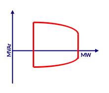 • at the right part of the curve (close to the rated voltage), the generator is constrained by the heat dissipation in the armature (stator for large generators).[1] The heating is proportional to the sum of squares of active and reactive currents, at the near-constant voltage it is closely proportional to the sum of squares of MW and MVAr, therefore this part of the curve (armature heating limit) resembles a section of a semicircle with the center at (0,0);