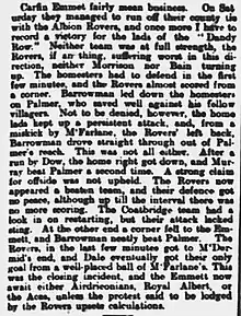 The club entered the Lanarkshire Cup every year until 1905–06, and the Qualifying Cup until 1907–08, but with increasingly diminishing returns; the club's final win in the Qualifying Cup was a 4–0 home victory over Longriggend in the first round in 1901–02, by which time "their ranks had been somewhat thinned",[17] with half-back Clifford being tried out at centre-forward, and scoring one of the goals.[18] The only other win it had in the Lanarkshire was over the soldier side of Hamilton Garrison in 1904–05, it being noted that Emmet had been inactive for most of the season.[19] Even in that case, the referee stopped the game shortly after half-time owing to the state of the Carfin pitch, but, with Emmet 3–0 up at the time of abandonment, Garrison ceded the tie rather than force a replay.[20] The financial struggle of trying to exist in an era of League football was shown by Emmet repeatedly switching Qualifying Cup ties in which it had been drawn at home to the "visiting" clubs, in return for a consideration; Albion Rovers paid £2 10s in 1902, and Clyde £8 in 1904.[21]
