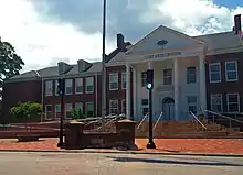The Raleigh and Augusta Air–Line Railroad arrived in Cary in 1879, creating Fetner Junction just north of downtown and spurring further growth. Sixteen Cary residents purchased Cary Academy in 1896 and converted it into the private boarding school, Cary High School, which had 248 students from across the state by 1900.[38][39][20] When the North Carolina legislature passed a law establishing a system of public high schools in 1907, Cary High School was transferred to the State for $2,750, giving Cary its claim of having the first state-funded public high school in the state.[39][40] Town bonds and the State funded a new brick school building in 1913; it was expanded in 1939 with WPA assistance.[25] Today that structure survives as the Cary Arts Center.[41]