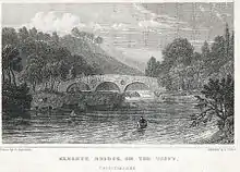 A bridge over the River Teifi at Cenarth has existed at least since 1188, when it was mentioned in the writings of Gerald of Wales.[3][4] The present bridge was constructed between 1785 and 1787[5] by Messrs Watkins and Webb.[6] It was designed by David Edwards (born 1748), who also built the Llandeilo Yr Ynys bridge near Nantgaredig earlier in 1786 and the later Newport Bridge.[5][7]