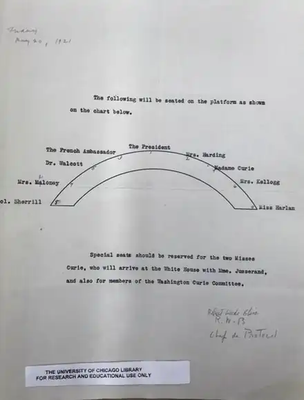 Seating chart: Charlotte Kellogg sits to left of Marie Curie at Radium Gifting Ceremony, 20 May 1921, East Wing of Warren G. Harding's White House